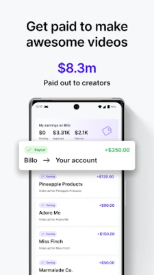 The Billo UGC platform for creators handles all the paperwork and payments, so you can focus on creating awesome videos. Enjoy regular and protected payouts, with no contracts or complicated negotiations.