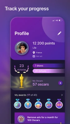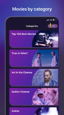 • Test your knowledge of cinema in a game format • Choose your favorite categories • Each category contains several levels of 15 multiple choice questions • Compete in battles with other participants • Play with friends • Choose an avatar • Get rewards for completing categories and many other achievements • Track statistics in your profile