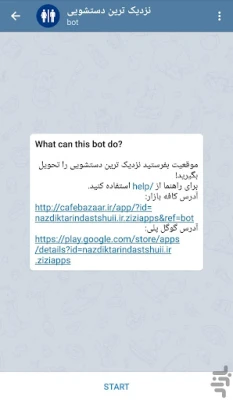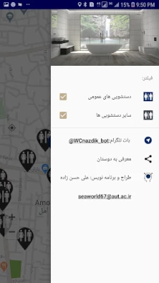 دستشویی ها به دو دسته عمومی (با رنگ آبی سیر) و سایر (با رنگ خاکستری مشخص شده و مثلا متعلق به کافه، رستوران، درمانگاه و... هستند) تقسیم شدند و شما می تونید با استفاده از فیلتر هر دسته ای که خواستید رو ببینید. نزدیک ترین سرویس های بهداشتی بین جاده ای و شهرهای گوناگون هم داخل اپ نمایش داده میشن. با کلیک روی هر دستشویی میتونید مسیر خودتون تا اونجا رو با نرم افزارهای مسیریابی دلخواهتان پیدا کنید. کافیه روی علامت مسیر ↱ کلیک کنید تا مثل سکرین شات آخر از بین نرم افزارهای مسیریابی مختلفی که نصب کردید انتخاب کنید تا مسیر بهتون نمایش داده بشه. این اپلیکیشن بات تلگرام هم داره که نزدیک ترین توالت عمومی رو نشون میده. لوکیشنی که میخواید رو به بات بفرستید، مکان دو دستشویی عمومی و یک دستشویی دیگه رو براتون میفرسته. این بات داخلش راهنما هم داره. این آدرس بات تلگرام نزدیک ترین دستشوییه: https://telegram.me/WCnazdik_bot