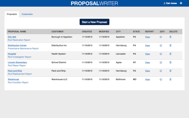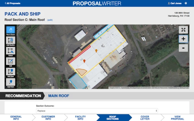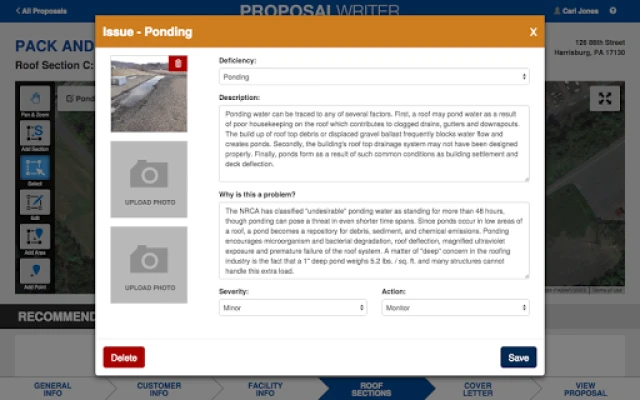 Carlisle Proposal Writer allows sales representatives and qualified roofing contractors to conduct rooftop inspections for potential roofing jobs prior to construction or repair. The roof inspector can quickly create a site drawing of the roof inspection area, catalog rooftop features and potentially problematic conditions on the roof. The software then generates a roof condition report for the building owner, facility manager or potential customer. With Proposal Writer a roof inspector can: