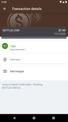 Add Tags, Notes, Images & Geo-Information: By enhancing transactions with custom tags, notes or photos of a receipt or check, you have the ability to stay organized and find exactly what you're looking for when searching through your finances.